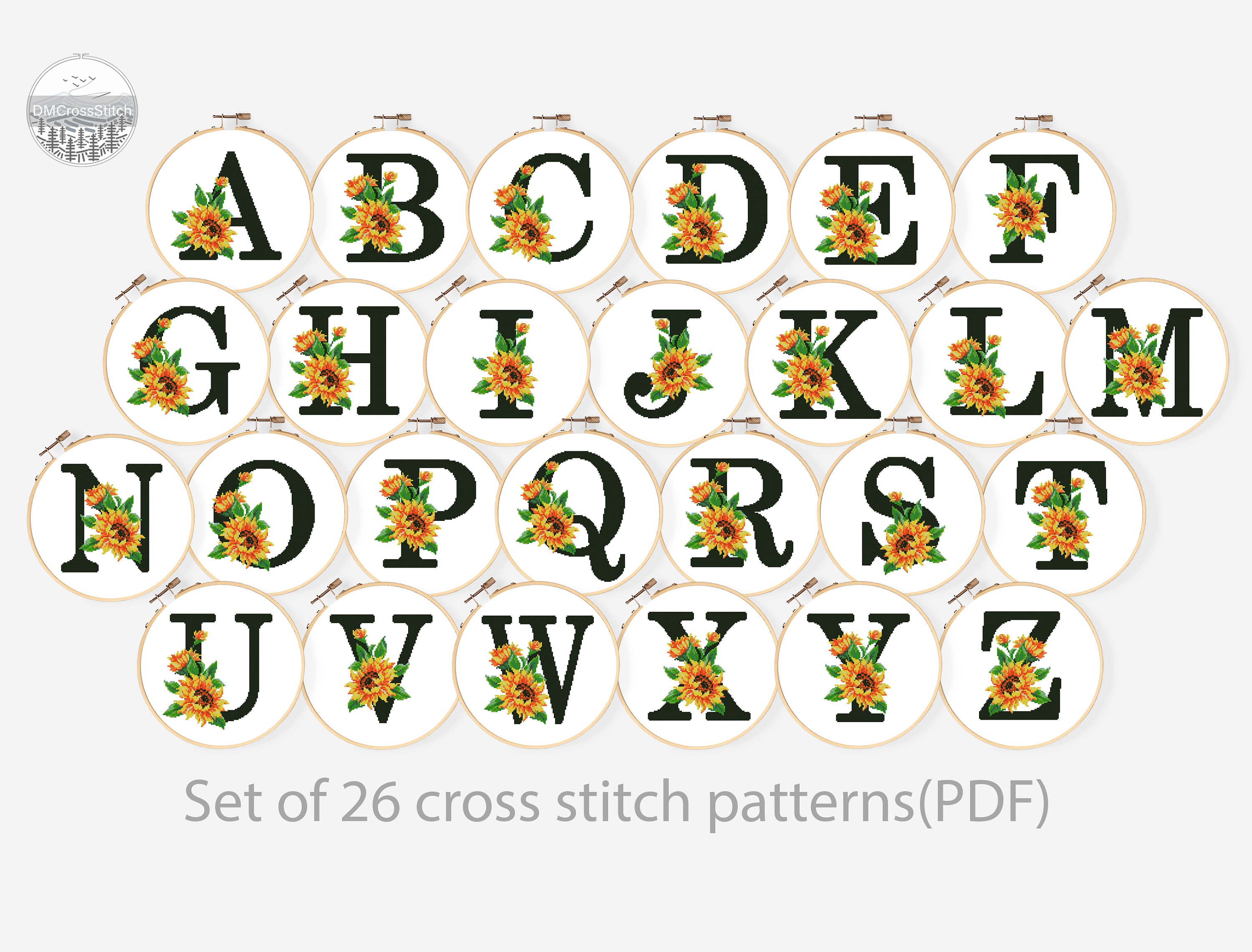 Set Of 26 Letters Modern Cross Stitch Pattern Monogram Floral Etsy